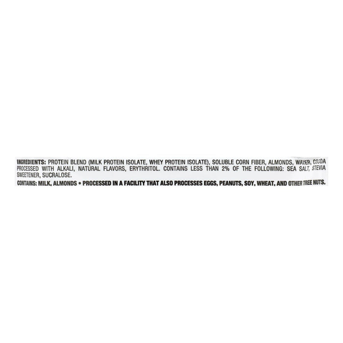 ingredients : protein blend;milk protein isolate;whey protein isolate;soluble corn fiber;almonds;water;cocoa processed with alkali;natural flavors;erythritol. Contains less than 2% of the following: sea salt;stevia sweetener;sucralose