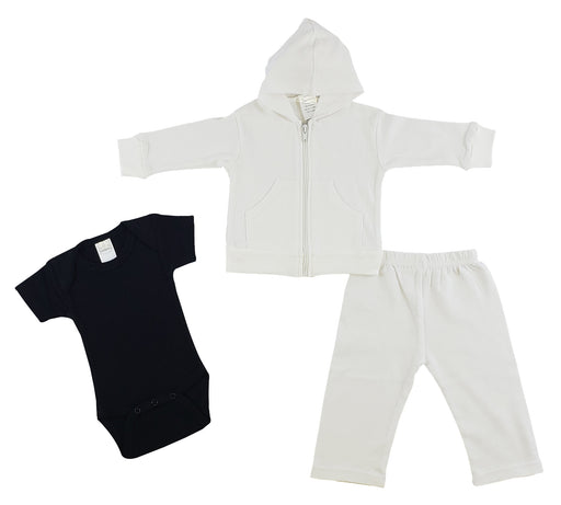 View full detailsBambini Onezies, Sweat Pants & Hoodie Set100% Cotton InterlockSizes: NB, S, M, LWhite Hoodie (100% Cotton), White Pants (100% Cotton), Black I...
