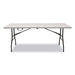 Sturdy in design, contemporary in appearance and surprisingly lightweight, Iceberg Resin-Top Bifold Tables feature a built-in carry handle and a convenient bifold format, where the tabletop folds in half while the legs fold up, to deliver an option that transports easily and stores compactly. Waterproof, scratch- and dent-resistant, the blow-molded, high-density polyethylene tabletop features rounded corners and soft-radius edges which both take away the sharp angles while allowing tablecloths to hang more neatly. Durable powder-coated steel legs with bracing bars ensure a solid, sturdy foundation. If you're looking for an indoor/outdoor table that's easy to set-up and take-down for offices, schools, trade shows, fairs, impromptu marketplaces or simply for outdoor parties, weddings and barbequesthese bifold tables might just be ideal.
