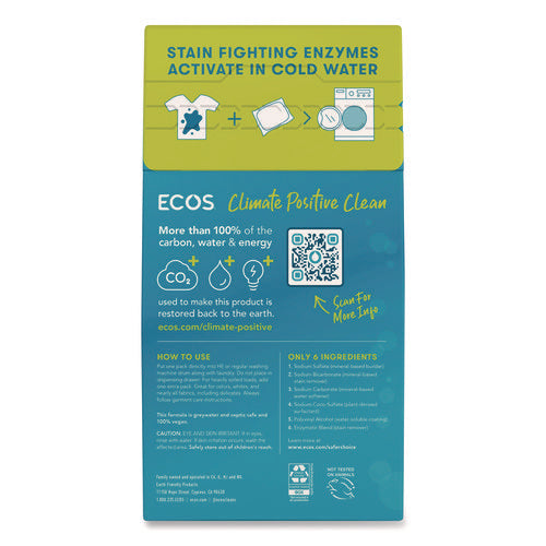 Redefining convenience, these sustainable, all-in-one laundry packs make washing a breeze. Our advanced, plant-powered formula harnesses the natural cleaning power of enzymes, which penetrate deep into fabric fibers to break down and eliminate stubborn stains, ensuring a thorough and effective clean with every wash. Say goodbye to sticky spills and hoisting heavy jugs, and elevate your laundry experience with ECOS the sustainable, convenient, and highly effective solution you've been searching for! Works well with all washing machines, temperatures, and cycles. 100% plastic free packaging reduces plastic waste, contributing to a sustainable future. Not tested on animals. Manufactured in a facility that is LEED Zero Carbon, LEED Zero Waste, and LEED Zero Energy Certified.