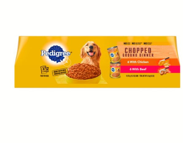 - CONTAINS A VARIETY PACK OF TWELVE (12) 13.2 oz. CANS PEDIGREE CHOPPED GROUND DINNER Adult Canned Soft Wet Dog Food, six cans with Chicken and six cans with Beef