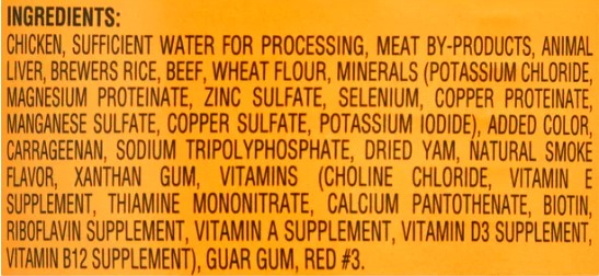 With Chicken: Chicken, Sufficient Water for Processing, Meat By-Products, Pork Liver, Brewers Rice, Minerals (Potassium Chloride, Magnesium Proteinate, Zinc Sulfate, Copper Proteinate, Manganese Sulfate, Copper Sulfate, Potassium Iodide), Sodium Tripolyphosphate, Carrageenan, Dried Yam, Guar Gum, Vitamins (Choline Chloride, Vitamin E Supplement, d-Calcium Pantothenate, Biotin, Thiamine Mononitrate [Vitamin B1], Vitamin A Supplement, Vitamin D3 Supplement), Xanthan Gum, Natural Flavor, Yellow #6, Yellow #5. With Beef: Chicken, Sufficient Water for Processing, Meat By-Products, Pork Liver, Brewers Rice, Beef, Vitamins (Choline Chloride, Vitamin E Supplement, Calcium Pantothenate, Thiamine Mononitrate, Vitamin A Supplement, Vitamin D3 Supplement), Sodium Tripolyphosphate, Added Color, Carrageenan, Dried Yam, Natural Smoke Flavor, Guar Gum, Minerals (Potassium Chloride, Copper Sulfate, Copper Proteinate, Magnesium Proteinate, Zinc Sulfate, Potassium Iodide, Manganese Sulfate), Xanthan Gum, Red #3.