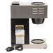 Simple switch-control office brewer that does not require plumbing or special wiring. Just pour cold water in the top and coffee brews immediately. Features two separately controlled warmers. Low profile design fits on most countertops. Stainless steel hood and base with black accents cleans easily with a damp cloth. SplashGard® funnel deflects hot liquids away from hands. Brewing capacity: 3.8 gallons per hour. Server(s) sold separately.