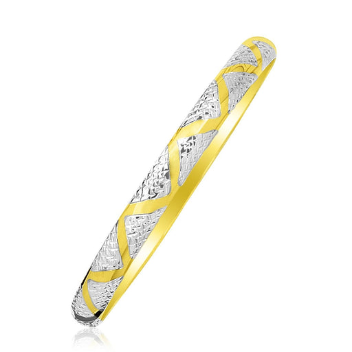 Eye-catching textured finish highlights the geometric diamond pattern style of this bangle. Crafted in 10k yellow and white gold, this comes in si...