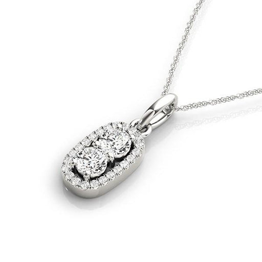 View full detailsThis two stone diamond pendant features a border of smaller sparkling side diamonds. An alluring piece made of 14k white gold.
