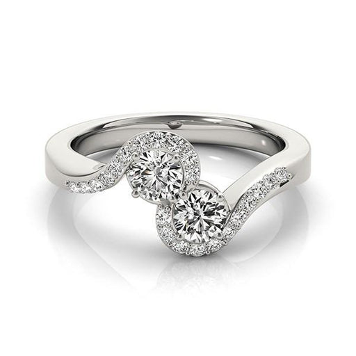 Utterly elegant, this curved band style diamond ring showcases two center stones with a half halo detailing. Crafted in 14k white gold.
