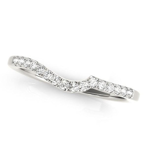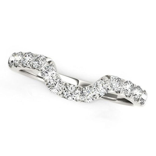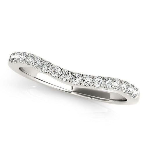 Showcasing, brilliant round diamonds this alluring wedding band features a lovely curved design made of 14k white gold.
