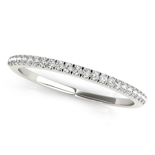 A Set of prong setting this round diamond wedding band is simply elegant a curved beauty made of 14k white gold.