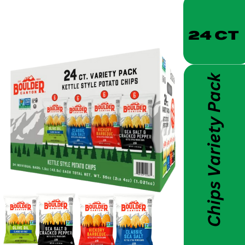 Description Indulge in a variety of tasty snacks with the Boulder Canyon Potato Chips Variety Pack 24 Count. Each pack contains 24 individual bags ...