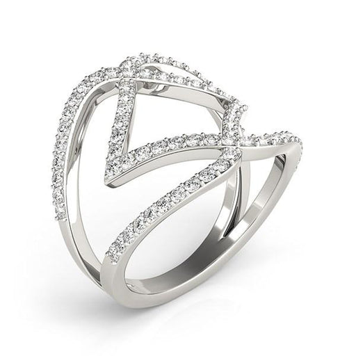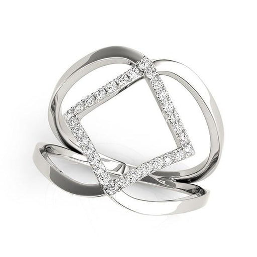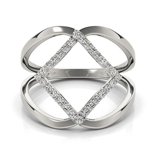 Pave set diamonds beautifully complement the polished intertwined band sections of this stunning ring. Designed in 14k white gold.