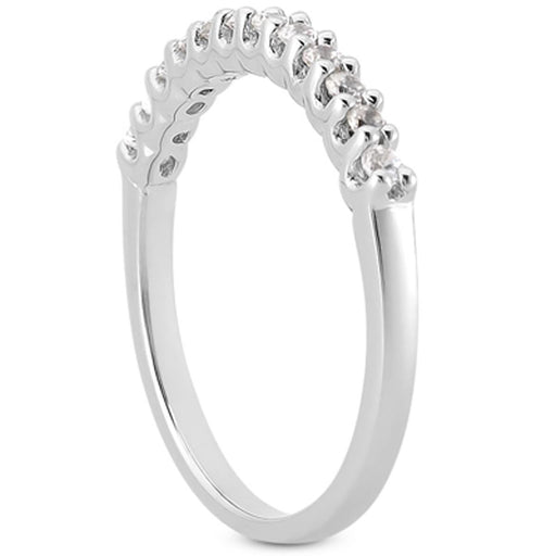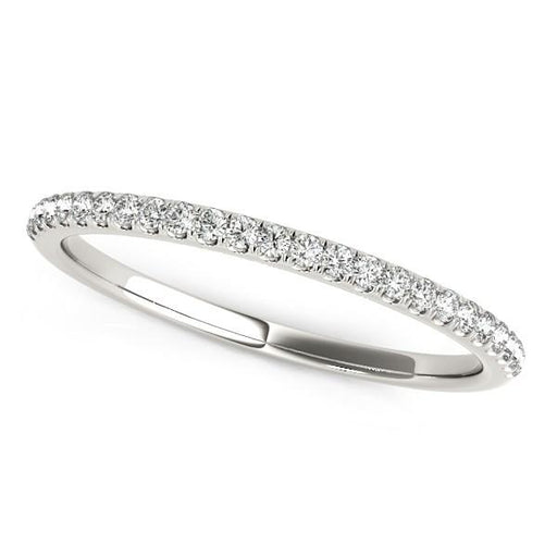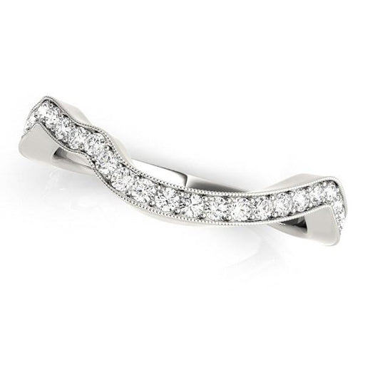 A curved style diamond wedding ring featuring pave setting and simple elegance. Designed in fine 14k white gold.