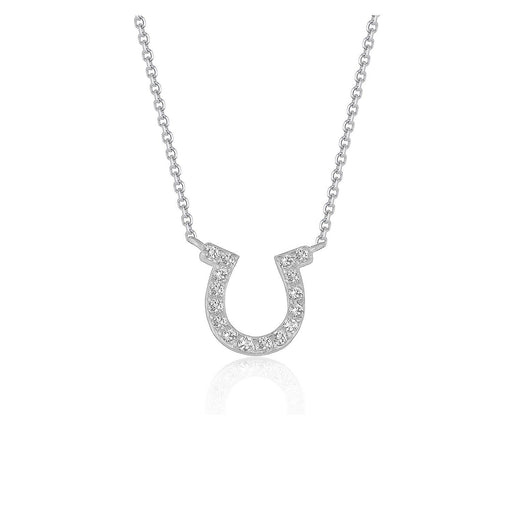 This classic diamond horseshoe design pendant features a 16 inches cable chain. Made of 14k white gold, this comes with a lobster lock.