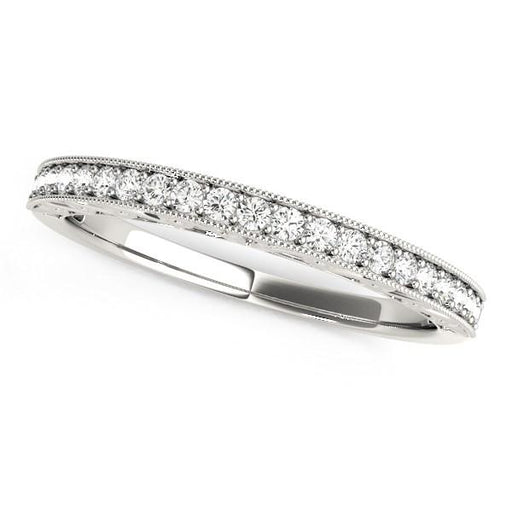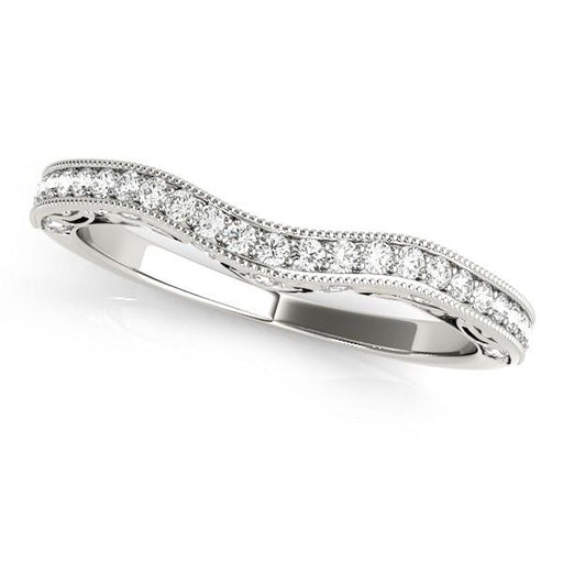 A delicate milgrained border, this curved design diamond wedding ring is utterly gorgeous made of 14k white gold.