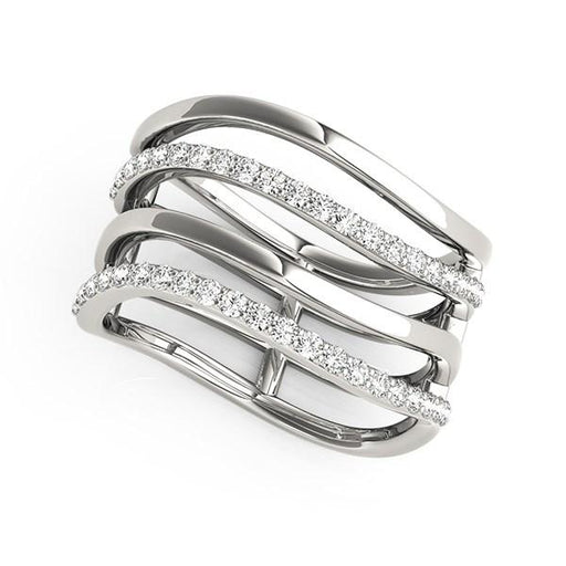 This ring designed with four wavy bands with alternating diamond-bedecked and polished styles made of 14k white gold.