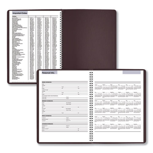 Weekly: one week per two-page spread; ruled block-style for open scheduling; past, current and two future months reference. Monthly: tabbed, full m...