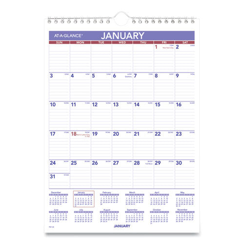 One-month view, plus a yearly calendar reference. Ruled daily blocks. Federal holidays printed in red. Wirebound with hanging loop. Full chipboard ...