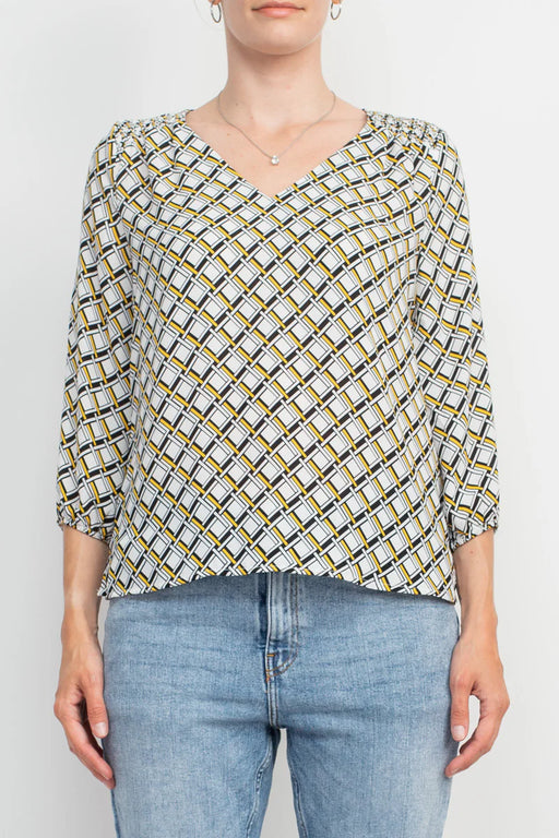 Counterparts V-Neck Elastic Shoulder Detail Elastic Cuff Multi Print Crepe Top