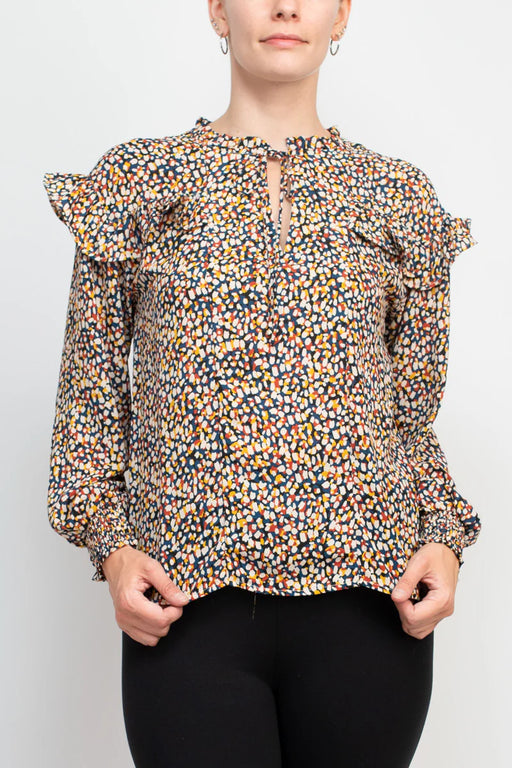 Counterparts crew tie neck elastic cuff long sleeve ruffle multi print chiffon top