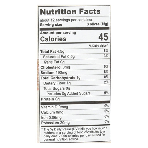 View full detailsDivina - olives frescatrano - case of 6 - 6 ozcountry of origin : italysize : 6 ozpack of : 6selling unit : caseingredients : olives;water;salt;l...