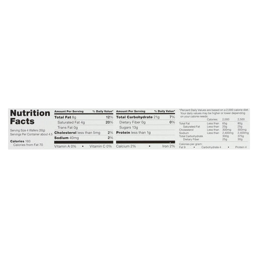 Per 4 wafers: 160 calories; 4 g sat fat (20% dv); 30 mg sodium (1% dv); 13 g total sugars. Forever gluten free. Gluten free. Certified gluten-free....