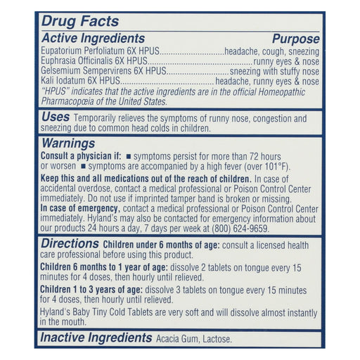 View full detailsHyland's baby tiny cold tablets are made from homeopathic ingredients such as kali iodatum and gelsemium sempervirens to promote natural relief for...