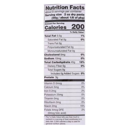 View full detailsA classic in texture and taste. Organic. Good consistent texture. Not mushy. Al dente. Wheat free. Gluten-free. Not mushy! promising a delightful e...