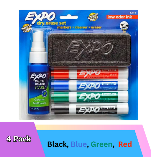 Highlights Low-odor ink is ideal for small offices and home offices. Set includes EXPO eraser, 2-oz. bottle of EXPO formula cleaner and four low-...