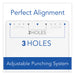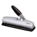 The wide grip, soft-touch lever makes punching large quantities 50% easier than with standard desktop punches. Top-quality cutting action with patented pin technology delivers clean and precise holes. Punch heads adjust for two- or three-hole punching; adjustable up to seven holes (additional heads sold separately). Multiple hole placements offer exceptional flexibility. Lever locks down for space-saving convenience. Paper-size adjustable. Pull-out tray for easy chip disposal. Durable metal construction.