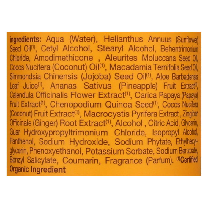 ingredients : water;aqua;helianthus annuus;sunflower;seed oil⁽¹⁾;cetyl alcohol;stearyl alcohol;behentrimonium chloride;amodimethicone;aleurites moluccana seed oil;cocos nucifera;coconut;oil⁽¹⁾;macadamia ternifolia seed oil;simmondsia chinensis;jojoba;aloe barbadensis leaf juice⁽¹⁾;ananas sativus;pineapple;fruit extract⁽¹⁾;calendula officinalis flower extract⁽¹⁾;carica papaya;papaya;chenopodium quinoa seed⁽¹⁾;macrocystis pyrifera extract;zingiber officinale;ginger;root extract⁽¹⁾;alcohol;citric acid;glycerin;g