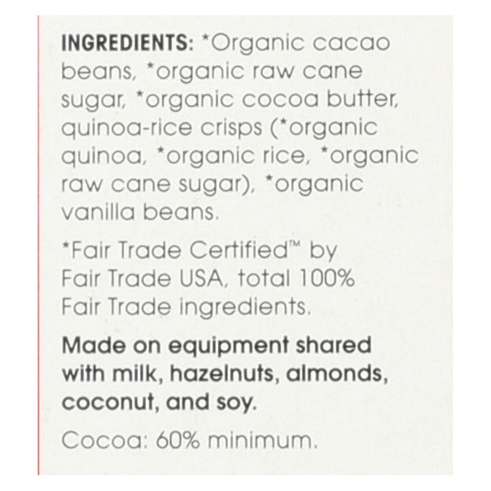 ingredients : organic cacao beans;organic raw cane sugar;organic cocoa butter;quinoa-rice crisps (*organic quinoa, *organic rice, *organic raw cane sugar);organic vanilla beans