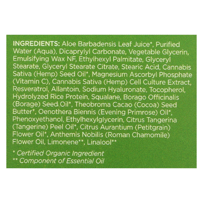 ingredients : aloe barbadensis leaf juice;purified water;aqua;dicaprylyl carbonate;vegetable glycerin;emulsifying wax nf;ethylhexyl palmitate;glyceryl stearate;glyceryl stearate citrate;stearic acid;cannabis sativa;hemp;seed oil;magnesium ascorbyl phosphate;vitamin c;cell culture extract;resveratrol;allantoin;sodium hyaluronate;tocopherol;hydrolyzed rice protein;squalane;borago officinalis;borage;theobroma cacao;cocoa;seed butter;oenothera biennis;evening primrose;oil;phenoxyethanol;ethylhexylglycerin;citrus