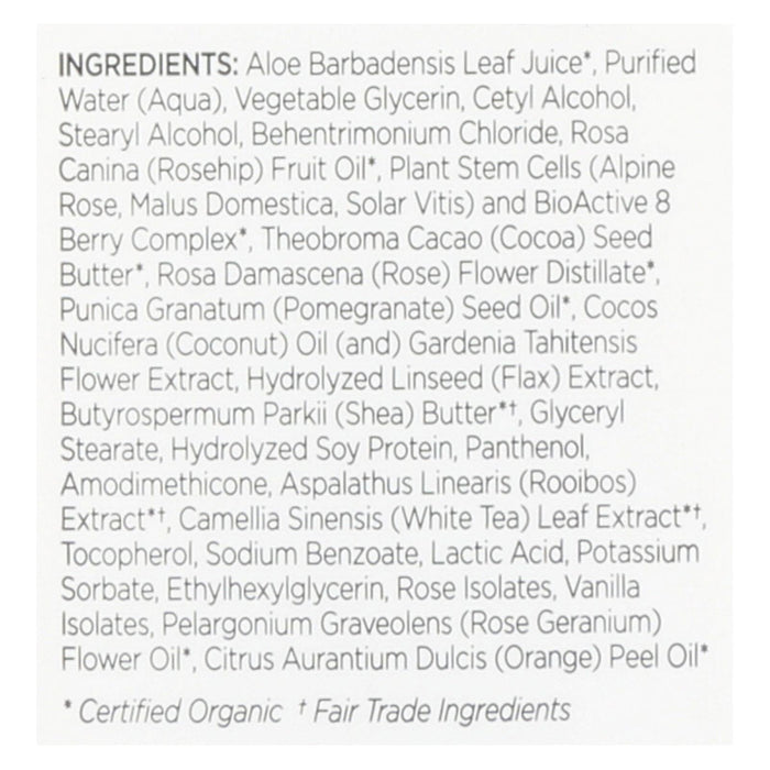 ingredients : aloe barbadensis leaf juice;purified water;aqua;vegetable glycerin;cetyl alcohol;stearyl alcohol;behentrimonium chloride;rosa canina;rosehip;fruit oil;plant stem cells;alpine rose;malus domestica;solar vitis;and bioactive 8 berry complex;theobroma cacao;cocoa;seed butter;rosa damascena;rose;flower distillate;punica granatum;pomegranate;seed oil;cocos nucifera;coconut;oil;and;gardenia tahitensis flower extract hydrolyzed linseed;flax;extract;butyrospermum parkii;shea;butter*†;glyceryl stearate;hy