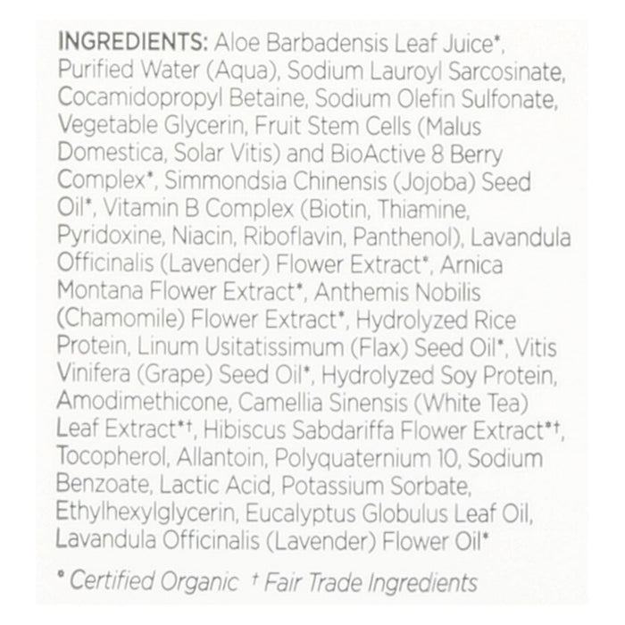 ingredients : aloe barbadensis leaf juice;purified water;aqua;sodium lauroyl sarcosinate;cocamidopropyl betaine;sodium olefin sulfonate;vegetable glycerin;fruit stem cells;malus domestica;solar vitis;and bioactive 8 berry complex;simmondsia chinensis;jojoba;seed oil;vitamin b complex;biotin;thiamine;pyridoxine;niacin;riboflavin;panthenol;lavandula officinalis;lavender;flower extract;arnica montana flower extract;anthemis nobilis;chamomile;hydrolyzed rice protein;linum usitatissimum;flax;vitis vinifera;grape;h