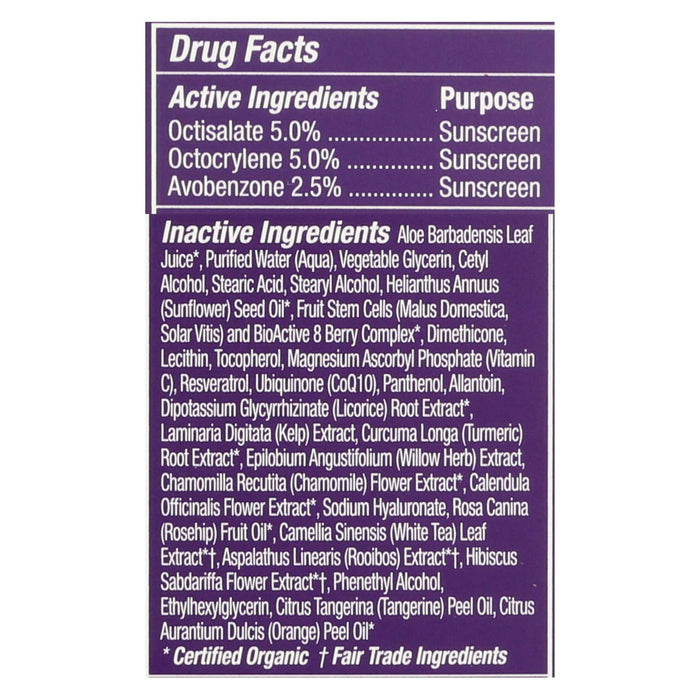 ingredients : drug facts active octisalate 5.0% purpose sunscreen octocrylene 5.0% purpose sunscreen avobenzone 2.5% purpose sunscreen inactive aloe barbadensis leaf juice;purified water;aqua;vegetable glycerin;cetyl alcohol;stearic acid;stearyl alcohol;helianthus annuus;sunflower;seed oil;fruit stem cells;malus domestica;solar vitis;and bioactive 8 berry complex;dimethicone;lecithin;tocopherol;magnesium ascorbyl phosphate;vitamin c;resveratrol;ubiquinone;coq10;panthenol allantoin;dipotassium glycyrrhizin