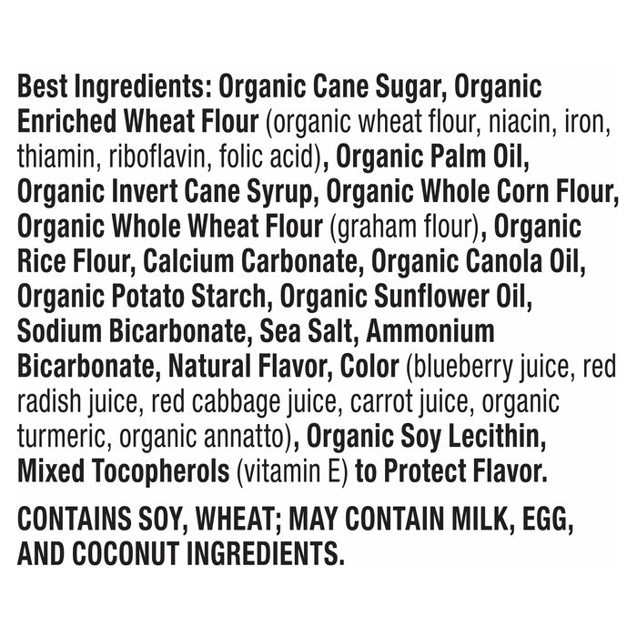 ingredients : organic cane sugar;organic enriched wheat flour (organic wheat flour, niacin, iron, thiamin, riboflavin, folic acid);organic palm oil;organic invert cane syrup;organic whole corn flour;organic whole wheat flour (graham flour);organic rice flour;calcium carbonate;organic canola oil;organic potato starch;organic sunflower oil;sodium bicarbonate;sea salt;ammonium bicarbonate;natural flavor;color (blueberry juice, red radish juice, red cabbage juice, carrot juice, organic turmeric, organic annatto);
