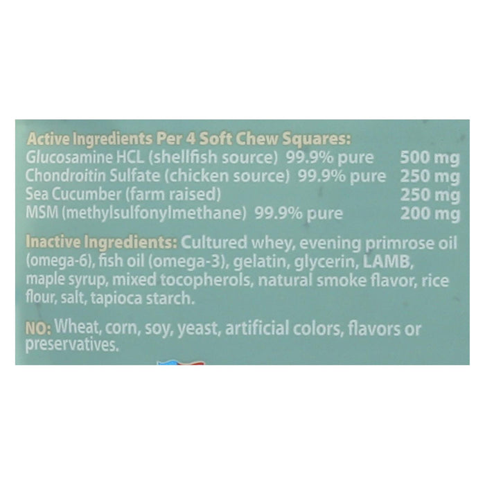 ingredients : active per 4 soft chew squares: glucosamine hcl;shellfish source;99.9% pure 500 mg chondroitin sulfate;chicken source;99.9% pure 250 mg sea cucumber;farm raised;250 mg msm;methylsulfonylmethane;99.9% pure 200 mg;inactive cultured whey;evening primrose oil;omega-6;fish oil;omega-3;gelatin;glycerin;lamb;maple syrup;mixed tocopherols;natural smoke flavor;rice flour;salt;tapioca starch