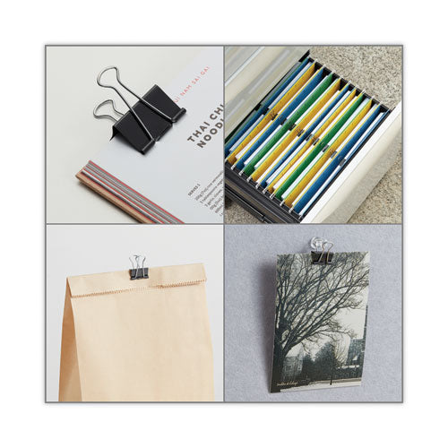 Ultra-efficient binder clips feature handles that can be hung, folded flat against clipped material, or removed for permanent binding. Efficient triangular design provides optimum strength and compression.