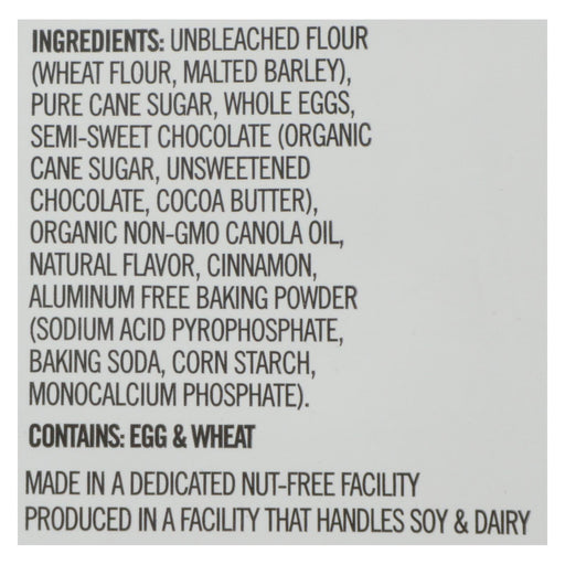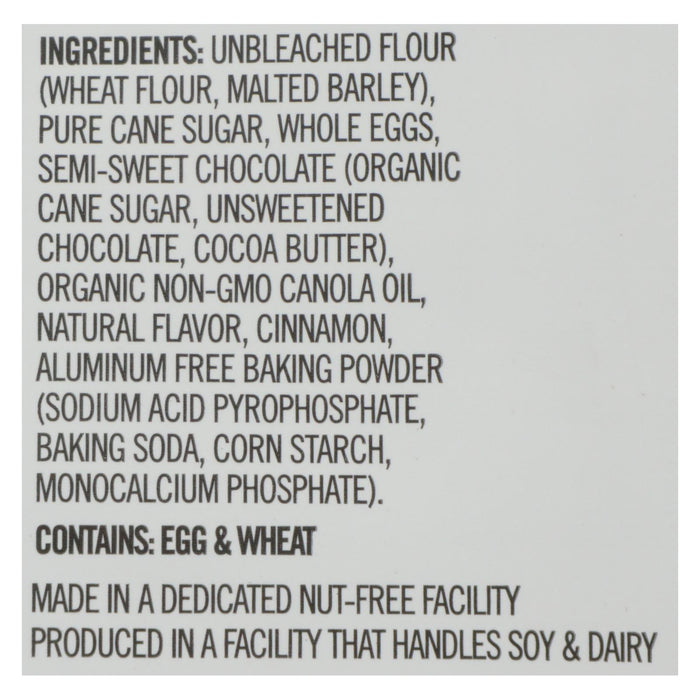 ingredients : unbleached flour (wheat flour, malted barley);pure cane sugar;whole eggs;semi-sweet chocolate (organic cane sugar, unsweetened chocolate, cocoa butter);organic non-gmo canola oil;natural flavor;cinnamon;aluminum free baking powder (sodium acid pyrophosphate, baking soda, corn starch, monocalcium phosphate)