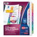 Organized documentation makes a business run like a well-oiled machine. These Ready Index Table of Contents Dividers help you stay organized so you can locate documents quickly and efficiently. They feature preprinted multicolor tabs that can be displayed in either landscape or portrait format. Using free templates from Avery Design & Print you can customize the included table of contents page and print in minutes. Organization and efficiency-makes life better for your business. For laser and inkjet printers.