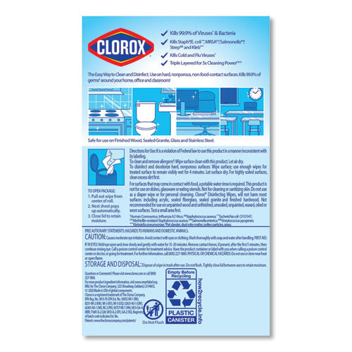 Clorox Disinfecting Wipes clean, disinfect and remove allergens leaving behind a pleasant scent. Disinfecting Wipes clean and disinfect with antibacterial power that kills 99.9% of viruses and bacteria that can live on surfaces, including COVID-19 Virus, staph, E. coli, MRSA, salmonella, strep and Kleb on hard, nonporous surfaces when used as directed. These all-purpose disposable wipes remove common allergens, germs and messes on surfaces like kitchen counters, bathroom surfaces and more. Disinfecting Wipes are safe to use on a variety of surfaces including non-food-contact surfaces in the home, office, daycares, schools, hotels, restaurants, and more. Use as directed. Allow product to air dry.