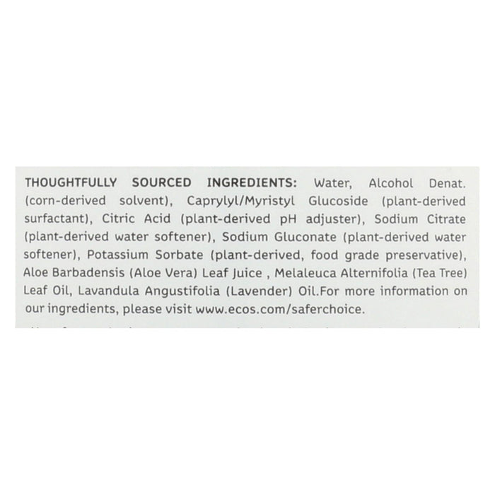 ingredients : thoughtfully sourced water;alcohol denat;corn-derived solvent;caprylyl/myristyl glucoside;plant-derived surfactant;citric acid;plant-derived ph adjuster;sodium citrate;plant-derived water softener;sodium gluconate;potassium sorbate;plant-derived;food grade preservative;aloe barbadensis;aloe vera;leaf juice;melaleuca alternifolia;tea tree;leaf oil;lavandula angustifolia;lavender;oil