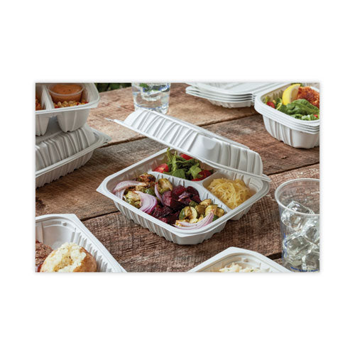 Earthchoice Vented Microwavable Mfpp Hinged Lid Container,3-compartment, 8.5 X 8.5 X 3.1, White, Plastic, 146/carton
