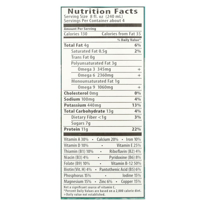 Edensoy original soymilk is made with ingredients like purified water, organic soybeans, naturally malted organic wheat and barley extract, kombu seaweed, sea salt, vitamin e, vitamin d2 and vitamin b-12. Each 32 fl. Oz. Container contains 4 servings of about 8 fl. Oz. Each. Each serving has 130 calories and 11 g. Of protein. See nutrition panel for allergens.
