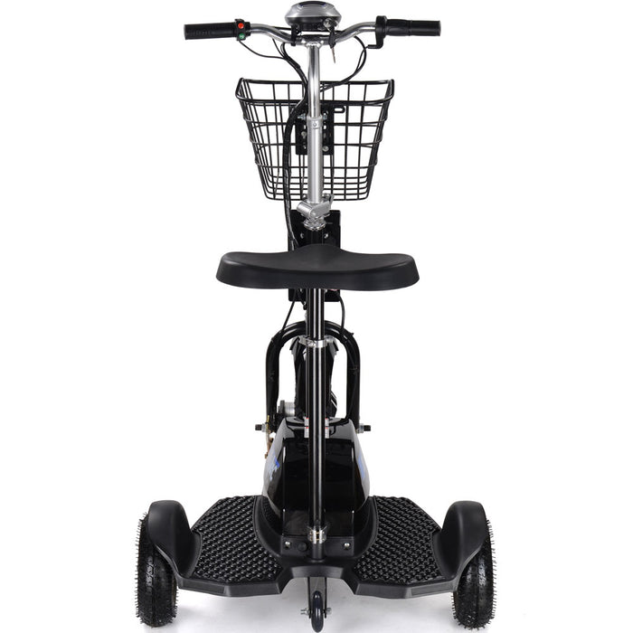 The MotoTec Electric Powered Trike aka Personal Transporter is a three wheel electric scooter that you can ride while sitting or standing, this makes it very convenient for use at events, security and warehouse floor operations or for just plain fun! It's like a three wheel Segway but at a fraction of the price! Powered by a 500 watt front wheel hub motor with speeds of 22 miles per hour. It can achieve a 20 plus mile range on a full charge. It features a 16" pneumatic front tire, two 9" pneumatic rear tires and a removable seat. This personal transporter is easy-to-operate with a twist throttle and left handle front drum brake system. Comes standard with key, battery meter light, front LED head light and carrying basket.
