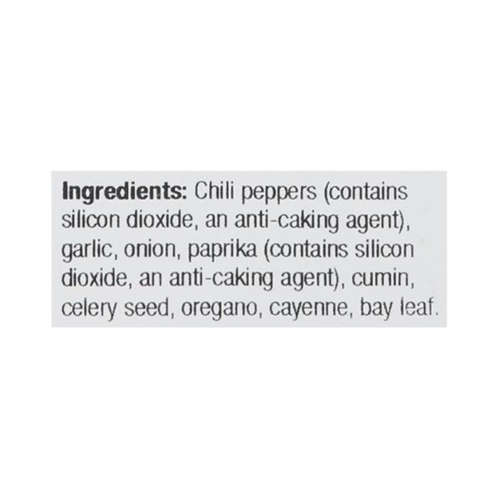 ingredients : chili peppers (contains silicon dioxide, an anti-caking agent), garlic, onion, paprika (contains silicon dioxide, an anti-caking agent), cumin, celery seed, oregano, cayenne, bay leaf.