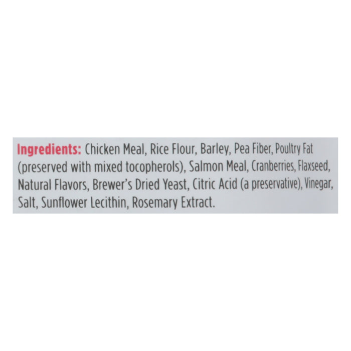 ingredients : chicken meal;rice flour;barley;pea fiber;poultry fat (preserved with mixed tocopherols);salmon meal;cranberries;flaxseed;natural flavors;brewer's dried yeast;citric acid (a preservative);vinegar;salt;sunflower lecithin;rosemary extract
