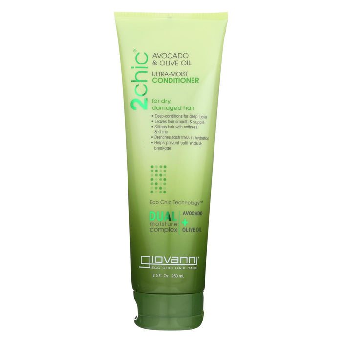 Giovanni, conditioner 2chic ultra-moist conditioner with avocado & olive oil is a product you can count on. It is made without any testing on animals. It is organic and vegetarian. Formulated for all hair types, it doesn't contain any dyes, parabens or other harmful chemicals, including pegs. The rich power of avocado and olive oil will banish frizz and smooth every strand. Each bottle contains 8.5 fl. Oz. Of conditioner.