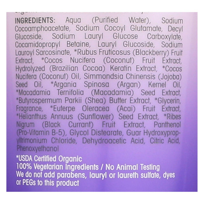 ingredients : aqua;purified water;sodium cocoamphoacetate;sodium cocoyl glutamate;decyl glucoside;sodium lauryl glucose carboxylate;cocoamidopropyl betaine;lauryl glucoside;sodium lauryl sarcosinate;rubus fruticosus;blackberry;fruit extract;cocos nucifera;coconut;hydrolyzed;brazilian cocoa;keratin extract;oil;simmondsia chinensis;jojoba;seed oil;argania spinose;argan;kernel oil;macadamia ternifolia;macadamia;seed extract;butyrospermum parkii;shea;butter extract;glycerin;fragrance;euterpe oleracea;acai;heliant