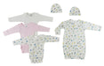 Girls Longsleeve Printed Onezie Variety 3 Pack (100% Cotton), Printed Baby Cap (100% Cotton), Printed Baby Cap (100% Cotton), Unisex Print Gown (100% Cotton)