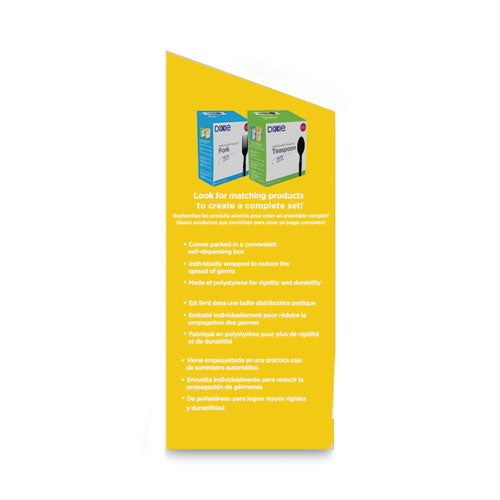 The Dixie® Medium-Weight Polystyrene Disposable Plastic Cutlery Grab-n-Go® lets you get rid of those messy, germ-collecting and wasteful open cutlery containers and replace them with individually wrapped forks in organized self-dispensing boxes. Dixie® Grab-n-Go® cutlery makes being well stocked super easy. The portable, disposable, easy-store boxes convert directly into quick-grab displays. Just open the box and put it on the counter (really). Grab-n-Go® cutlery puts a stay-well spin on break time. Each piece of the Dixie® plastic cutlery is protected by its own plastic covering, so the only person who touches it is the person who uses it. That's called good hygiene. These medium-weight individually wrapped plastic cutlery are great for most foods; perfect for office breakrooms, restaurants and more.